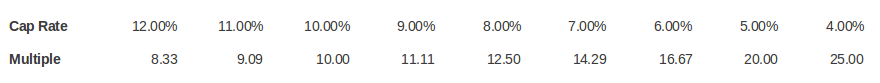 As shown above, cap rates and price/earnings multiples are inversely related. In other words, as the cap rate goes up, the valuation multiple goes down.