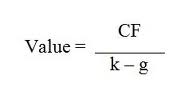 This formula solves for Value, given cash flow (CF), the discount rate (k), and a constant growth rate (g). From the definition of the cap rate we know that Value = NOI/Cap. This means that the cap rate can be broken down into two components, k-g. That is, the cap rate is simply the discount rate minus the growth rate.